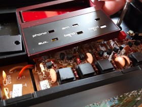 Es sind dafür zunächst die Knöpfe abzuziehen (keine Gewalt). Der Pegelsteller-Knopf ist durch eine versenkte Madenschraube mit 1,5mm Sechskant Innengewinde (Imbus) gesichert. Diese Madenschraube muss dafür gelöst werden.