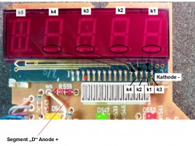 • zweiten Lötpunkt von rechts (k1) - "D"-Segment im 1. Ziffernblock ganz rechts leuchtet schwach auf.