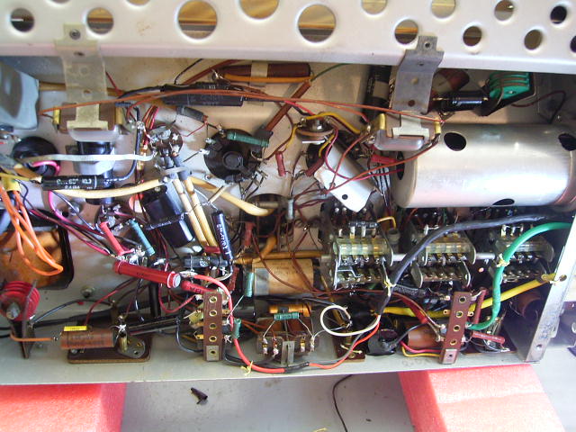 Den originalen Kabelbaum habe ich der einfachheithalber aufgesplittet um die Leitungen durch schon vorhandene Löcher im Chassis durchlegen zu können.Alles in allem schon eine Fummelei und es ist mir nach wie vor unklar wie man diesen Schleppschalter mit normalen Schrauben da festgeschraubt bekommt.Es ist auch nicht ganz ohne,den Wellenschalter mit der Madenschraube auf der Welle fest zu schrauben,weil man da eigentlich ebensowenig drankommt.Jedenfalls funktioniert die Sache sehr schön und ich war angenehm überrascht,daß der Klang des Rekord doch so gut sein kann.Die Leistungsaufnahme ist von ca.85 auf 98 Watt gestiegen.