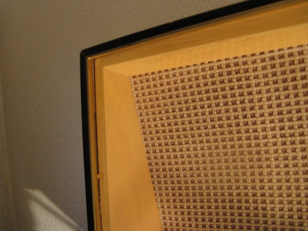 Nun kommt wieder der Lautsprecherstoff dran. Er ist trocken und verzogen (er hat sich stellenweise vom Rahmen gelöst):