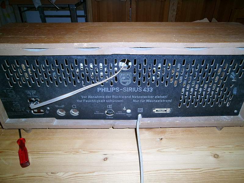 ich miste meine Werkstatt aus und habe da was das vielleicht noch jemand brauchen kann. Es handelt sich um ein Philips Sirius 433. Der Zustand ist leider sehr schlecht. Das Gehäuse ist verkratzt und an ein paar Stellen fehlt Furnier. Das Skalenglas sieht auch nicht besonders gut aus, die Farbe blättert ab.
