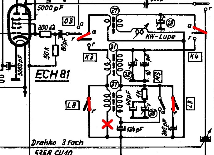 Und hier setzt meine Bitte um Hilfe ein, da mich die Schaltung komplett überfordert: Zwischen den beiden L-Pertinaxstreifen liegen mehrere Spulen mit haarfeinen Drähten. Bei der Spule, die durch L5 im Ruhezustand gebrückt wird, lag der Draht frei, der auf Masse gehen sollte. Ich habe ihn wieder angelötet. Hat keine Besserung gebracht. Nach langem Suchen bin ich auch bei L8 fündig geworden, nur ist es dort umgekehrt: Dort habe ich einen haarfeinen Draht, der am 5nF hängt, der auf Masse geht. Aber er endet vor der Spule. An der Spule aber sieht nichts danach aus, als sei der Draht je von dort gekommen. Bilder und Schaltungsausschnitt sind unten.