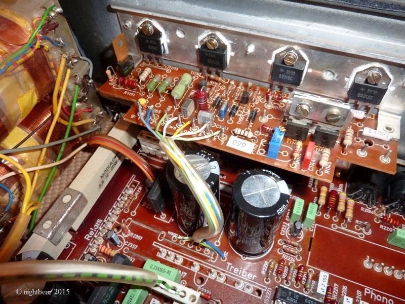 Während der Behandlung der ersten Module und der Grundplatinen habe ich dann besonders auf die Reinigung und das Ausrichten und richtig Einlöten verkippter und durch die Platine "durchgenagelter" Bauteile geachtet und erlaube mir den Luxus, Trimmpotis und Elektrolytkondensatoren generell zu ersetzten. Definitiv erforderlich ist dies nach meinen Messergebnissen bisher in diesem Gerät "nur" bei ca. 12 Bauteilen gewesen, aber der Receiver soll noch ein paar Jahrzehnte störungsfrei laufen, wenn ich mit ihm fertig bin.