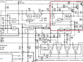 Ein Elko ist ein Matsushita MR (gelbe Farbe). Er liegt als Koppelkondensator im Signalweg zwischen dem externen Filter und der nachgeschalteten Verstärkerstufe im U401 (C314). Diese Typen findet man oft in ambitionierten HiFi Geräten dieser Zeit, sie haben besonders gute Isolationswiderstände bzw. niedrige Restströme. Hier liegt noch ein Umschaltkontakt am Eingang, da will man Knack- und Krachgeräusche natürlich vermeiden,