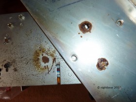 In den Seiten der Holzgehäuseschale sind großflächige starke Metallwinkel eingeklebt und verschraubt, die das Chassisim Gehäuse halten. Der verwendete Kleber ist jeweils durch 2 Löcher gequollen und hat sich auf den Seitenteilen des Chassis verteilt. Er war offenbar aggressiv und hat die Zinkschicht zerfressen: