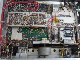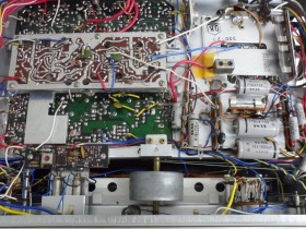 Den zweiten KT-7000 hatte ich als "spielbereit und in Ordnung" gekauft. Spielbereit stimmte, aber technisch in Ordnung - nein. Innen gab es eine hingefriemelte abenteuerliche Drahtkonstruktion, um die Achse des Flywheels am Tuning-Knopf zu halten, denn die Befestigung des Achsenlagers war abgebrochen. Der Vorbesitzer (oder ein beauftragter "Reparateur") hatte offenbar verzweifelt versucht, den abgerissenen Stahlwinkel auf den Chassis-Träger aufzulöten. Ein hoffnungsloser Versuch, denn Stahl lässt sich ja nicht löten.Dann die hingebogene Drahthalterung als letzte Rettung. Ich war etwas verärgert, da mir der Verkäufer diesen Mangel verschwiegen hatte. Ich konnte den Stahlwinkel mit zwei M3-Schräubchen wieder korrekt befestigen, nachdem ich in das Chassis, zwei passende Gewinde geschnitten hatte. Darauf liess sich dann das Achslager wieder befestigen - so einfach kann die Lösung sein.