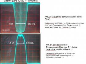 Das Innere enthält zwei TOKO Übertrager und zwei Quarze in der Standard-Bauform, alles dicht an dicht. Ich konnte in der Schaltung die ZF-Durchlasskurve über beide Toyo-Filter ermitteln. Die -3dB Bandbreite beträgt 280 kHz über beide Filter. Die Bandpassbreite des Einzelfilters wird also noch etwas grösser sein. Beeindruckend ist die gute Symmetrie und die perfekte Mittenfrequenz von 10.700 MHz (gemessen: 10.699 +/- 0.001 MHz).