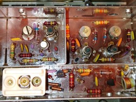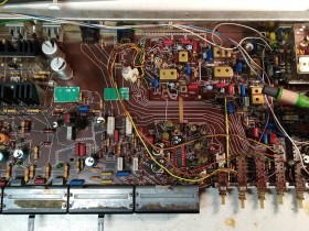 Das Gerät war in einem beklagenswerten Zustand, als ich es erhielt: großer Riss in der Hauptplatine, eingedrückter Preomat, UKW-Teil nicht angeschlossen, gebrochene Sicherungshalter und Potischleifer (Ruwido, ohne Kunststoffteil) aufgrund von versprödetem Messing. Dafür gab es keinen einzigen defekten Kondensator.