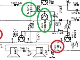 heute habe mal eine Frage zu Kondensatoren. Ich habe ein Kofferradio ITT Touring 102 erstanden - in sehr schlechtem Zustand. Es spielte nicht; mit einem Signalverfolger waren schnell der Treiber (BC 108B) sowie der Koppelkondensator (1µF) als Ursache gefunden. Ich habe dann noch die beiden 1000µF Elkos getauscht. Alle 4 Teile sind im Schaltplan-Ausschnitt markiert: