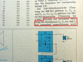 Man beachte den umrandeten Text. Es geht um die Ankopplung des Hochtonzweigs. Ich habe es damals genau so gemacht wie im Artikel beschrieben: Der Hochtonzweig ist hinter dem Hochpasskondensator des Mitteltöners angekoppelt, nur sind bei mir die Trennfrequenzen 450 Hz und 6,5 KHz.