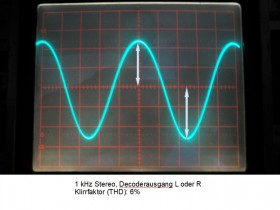 Interessanterweise kehrte sich die Beobachtung um, nachdem ich die Stereo-Anzeigebirne (12V/50mA) erneuert hatte. Nun hatte ich bei UKW-mono 1,2% THD und bei UKW-stereo fast unglaubliche 5-7% Klirr. Nach einem vollständigen FM-ZF Neuabgleich änderte sich daran nichts. Ich habe ein Foto vom Schirmbild des 1 kHz Sinus mit 6% Klirrfaktor gemacht. Bei nur oberflächlicher Betrachtung bzw. ohne Klirrfaktormessung ist die starke Verzerrung gar nicht so einfach zu erkennen, daher "tückischer Fehler".
