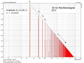 Ein Rechtecksignal einer Frequenz F lässt sich durch die (theoretisch unendliche) Reihe (Summe) der Grundfrequenz und dessen ungeradzahligen (2n-1) Oberwellen darstellen (Fourier-Analyse). Praktisch zeigt die Fourier-Darstellung des von mir verwendeten 30 Hz Rechtecksignals dieses Bild (Grundfrequenz und Oberwellen):