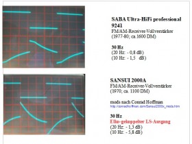 die Gegenkopplung der Endstufen in den SABA-Receivern der 92xx-Serie ist als Tiefpass ausgelegt. Das führt beim Übertragungsverhalten der Endstufe zu Hochpassverhalten. Man kann das ändern, indem man den Gegenkopplungselko nach Masse vergrößert. Dazu wurde hier im Forum schon einiges untersucht, probiert und dokumentiert. Dann verbessert sich auch das Rechteckübertragungsverhalten bei 30Hz.