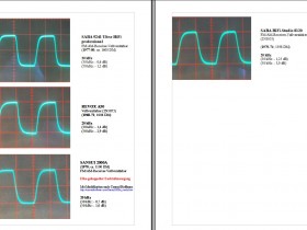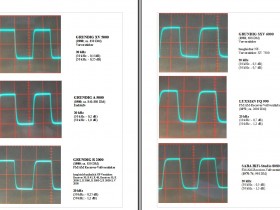 Bei den Geräten von 1980 und jünger ist generell eine bessere Flankensteilheit erkennbar als bei den 70iger-Jahre Verstärkern. Ich vermute den Grund in der besseren slew rate der neueren "schnelleren" Leistungstransistoren, die die Bandbreite deutlich verbessert haben. Das beste Ergebnis mit dem 20 kHz-Rechtecksignal hatte ich mit dem Grundig Vorverstärker XV 5000 und der Grundig Endstufe A 5000. Danach folgen Grundig R 2000, SXV 6000. Der Saba 9241 schneidet aber nicht deutlich besser als der Saba 8080 (F) ab, allerdings bei sehr viel grösserer Ausgangsleistung beim 9241.