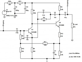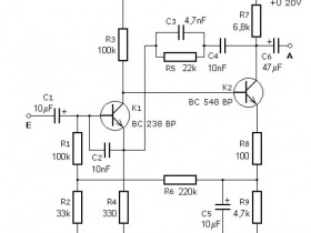 Diese Schaltung stammt aus dem Dual CR60 und liegt mit ihren 14.3V Versorgungsspannung nahe an den vorhandenen 12 V. Zu beachten ist, dass die folgende Stufe einen hohen Eingangswiderstand besitzt. Das hat Folgen für den Frequenzgang, wenn man einen Line-Eingang verwendet, der in der Regel 47 kOhm Eingangsimpedanz haben sollte. Bei dieser Schaltung bildet der Ausgangskondensator mit dem Eingangswiderstand der Folgestufe einen Hochpass. Bei 47kOhm Eingangswiderstand werden tiefere Frequenzen schon zu stark bedämpft.