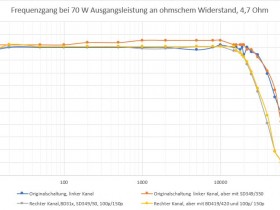 Die Transistoren BD419/ BD420 im TO202-Gehäuse sind zwar noch als Restposten erhältlich, werden aber schon lange nicht mehr hergestellt und sind entsprechend teuer. Ich habe sie auch nicht eben mal herumliegen. Ich habe die Schwingungen nach etwas Probieren beseitigen können, indem ich zwei Kondensatoren im Spannungsverstärkerteil der Endstufe vergrößert habe. C1303 hat jetzt 150 pF, C1306 100 pF.