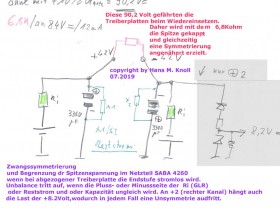 In meiner Skizze <Zwangsymmetrierung> ging ich davon aus, dass wenn die Treiberplatte abgezogen wird, die Endstufe stromlos wird. und als Folge die Elkos ohne den 6,8Kohm an 3 Stellen, Plus1 und 2 sowie Minus 1, (linker Kanal) dort wo nicht die -8,2 Volt abgezweigt werden eigentlich auf den 1,4fachen Wert aufgeladen werden. Ich hatte dafür statt 2x42Volt, als Summe +/- 90,2 Volt genannt.Damit wollte ich belegen, dass wenn ein Modul abgezogen wird, dieses bei wieder einstecken, nicht mit 2x 42 Volt (84V) sondern mit 2x45,1Volt (90,2V) erhält und damit das eine oder andere (auch komplizierte) Ereignis ausgelöst werden kann. Um das Ansteigen auf diese 90,2Volt zu vermeiden, meine ich, hat SABA ursprünglich die Vorlast 2x 6,8Kohm im Netzteil parallel zur Endstufe geschaltet. Die Messungen von oldiefan (Reinhard) ergaben aber, dass bei Entfernen der Treiberplatten, ganz gleich ob mit oder ohne Vorlast, die Spannungen sich nicht nennenswert erhöhen.Das sind z.B. mit Vorlast bei 220V~ mit Treiber 40,1 Volt auf 40,6V ohne TreiberDazu ohne Vorlast bei 220V~ mit Treiber 40,1 Volt auf 40,6V ohne Treiber 40,9V.Das heißt, weder das entfernen des Treibermoduls, noch die entfernte Vorlast,lassen die Spannungen an den Lade -Elkos auf den 1,4fachen Wert ansteigen, der sich bei Leerlauf ergeben müsste.Das deckt sich überhaupt nicht mit meiner Meinung.Damit ist aber abgedeckt, wieso es keine negativen Ergebnisse gibt, wenn die 6,8Kohm bis zu 33Kohm erhöht werden. Was ist es dann?Bei einem betriebsfertigen Gerät, wird vom T1108 BSW39/6 via Stecker 11 ein Strom in den Basisteiler von T1144 (R1142 bis R1143) geschicktT1108 wird von der Differenzstufe T112 und T1114 und T1124 kontrolliert angesteuertWobei es sich um eine geschlossen Schleife handelt, wirkt wie ein IC als Op.Amp. .Steht der Schleifer von R1143 weit oben bei R1142 , ist der T1144/ BD417 leitend bisUc-e sat. Die Basen der Transistoren T1145 und T1171 / BD417und BD418) erhalten sowenig Basisspannung dass sie gesperrt sind. Die Basen der 4Endtransitoren, BDV94 und BDV93 liegen an den jeweiligen Emitter und sind Stromlos. Der Strom (Ruhestrom) der Endstufe ist damit NULL. Bewegt man den Schleifer von T1143 (100Ohm) in Richtung R1443 (Emitter von T1143)Wird der Transistor T1144 (BD417) langsam gesperrt und die Basis-Emitterstrecken der beiden Transistoren T1145 und T1171 erhalten eine Spannung wie sie am C-E des T1144 steht. Bei ca . 2x Ub-e werden T1145 und T1171 leitend und der Spannunsabfall an R1147 und R1171 in deren Kollektorkreis steuert die Endstufen T115,1152, 1173 und 1174 soweit auf, bis deren Ub-e erreicht wird und der Normruhestrom fließt. Tut sie das auch wenn man die Treiberplatte abzieht? Nein weil, weil durch den Basisteiler (Ruhestrom Einsteller) kein Strom fließt der ja von T1108 BSW39/6 auf der Treiberplatte zum Teiler gelangen müsste, was aber nicht der Fall ist. . Die Messreihe von oldiefan sagt aber, das abziehen der Treiberplatte, bewirkt nicht den zu erwartenden Anstieg der Lade-Elkos auf Unenn (42V) x 1,4 auf ca. 90,2 Volt.Das sagt mir, die Endstufe ohne Treiberplatte muss noch Strom ziehen.Nicht einmal die abgeklemmten 6800Ohm, können das überdecken.Nur Fehlströme oder /Restströme der T1165 und T1171 (BD417/418) könnten das machen.Misst man wie gewohnt den Ruhestrom an R1161 mit und ohne Treiberplatte, muss sich das zeigen. Ich habe keine Idee, wer die Lade –Elkos nicht hoch laufen lässt, wenn die 6,8Kohm und die Treiberplatte entfernt sind.