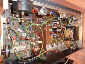 man kann aber auch Mist bauen - auch und gerade die Japaner mit ihren ach so soliden Alufronten. Schaut euch das Bild an. Marantz 2215 (1974). Der Skalenseilzug! Der Fixpunkt des Seils am Skalenzeiger liegt nicht auf einer Linie mit den Umlenkrollen. Ergebnis: Die Seilspannung - ohnehin recht straff, es darf trotz der großen Länge nicht rutschen - ändert sich beim Durchstimmen. Der Drehkondensator ist nur mit der Hf-Platine verbunden, ohne Abstützung am Chassis. Ergebnis: Beim Abstimmen biegt sich - sichtbar! - die ganze Hf-Platte durch.