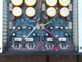 Man kann gut den Doppel-Mono-Aufbau erkennen. Die LS-Buchsen hinten sind von Hirschmann und nicht original (da waren recht einfache drin, die m.E. nicht viel taugten). Dann pro Kanal ein Ringkerntrafo, Gleichrichter, Siebung mit Pi-Filter. Sicherungen in der Zuleitung zu den Ausgangstransistoren, daneben die Stabilisierung der Spannung fuer die anderen Stufen. Im Eingang dann symmetrische Differenzverstaerker (mit selektierten Quartetten, je 2 thermisch gekoppelt), und eine ebenfalls symmetrische VAS (Spannungsverstaerkungsstufe). Danach Treiber und Ausgang --- im Grunde alles so angeordnet wie im Schaltplan).
