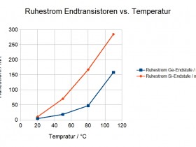 In beiden Fällen (Ge- und Si erfolgt ein überproportionaler Anstieg des Ruhestroms mit der Temperatur. Im Fall der Si-Endstufe ist der Anstieg aber sehr viel schneller/steiler als bei der Ge-Endstufe. Während bei der Ge-Endstufe bei ca. 80°C nur ca. 40 mA Ruhestrom erreicht werden (Körting Service-Anweisung nennt als Ruhestrombereich 4 bis 40 mA), sind es bei der auf Si-umgebauten Endstufe fast 170 mA bei 80°C.