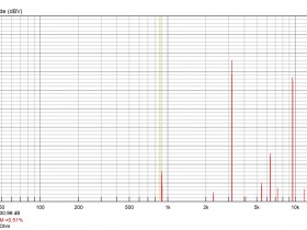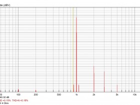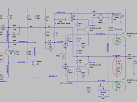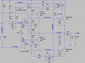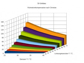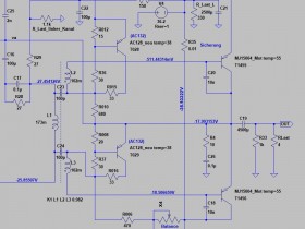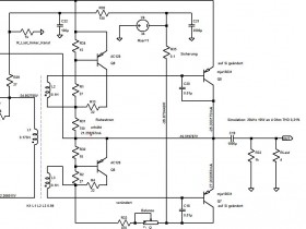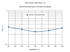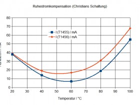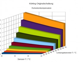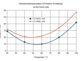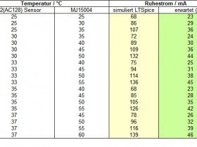 Der Ruhestrom sinkt mit zunehmender Temperatur, bei Raumtemperatur liegt er bei ca. 25-30 mA. Das Signal ist symmetrisch zur Mitte der Betriebsspannung. Die AC128 werden mit ca. 10 mA nicht überlastet, das Ausgangssignal ist sauber. Aber: die zusätzlichen Widerstände verstärken den Einfluss der Symmetrieeinstellung auf den Ruhestrom. Gegebenenfalls muss man mit den Widerständen zwischen Basis und Emitter der AC128 etwas spielen.