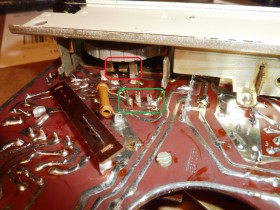 Von der Rückseite sieht man nach Ausbau der kleinen Trägerplatte den Schalthebel (rot), der mit dem Rad am Lautstärkeregler hin und her geschwenkt werden kann und die 3 Lötösen für den Anschluss des Schalters auf der Grundplatine (grün).