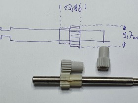 Welle in die Standbohrmaschiene, hohe Drehzahl, mit Feile vorsichtig glätten und auf Maß bringen. Dann das Ritzel vorsichtig passend aufreiben.