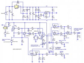 Die Spannungsversorgung erfolgt über einen kleinen 12V/1,8W Printtrafo mit Gleichrichter, Siebung (1000 µF), LM317 Regler für 10,0 V (LM 317 Regelpoti auf ca. 1,6 kOhm). Die symmetrische Masse wird über Spannungsteilung mit zwei 47kOhm Widerständen und einem weiteren OPV erzeugt, der so beschaltet ist, dass er eine Verstärkung von >10 aufweist (für den Fall, dass ein OPV verwendet würde, der bei Einheitsverstärkung nicht stabil wäre und wenigstens eine Verstärkung >10 benötigt, um stabil zu arbeiten). Ich musste feststellen, das sog. Power-OPVs (z.B.L61) hier ungeeignet sind, da der kleine Trafo dafür zu geringe Spannung und Strom liefert und damit keine +/- 5V mehr zustandekommen. Die Spannungsanschlüssen an den OPVs sind jeweils mit 100 nF abgeblockt, um HF fernzuhalten.