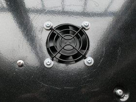 Die kleine Lochrasterplatine links enthält die Schaltung (ich gehe mal davon aus, dass Christian hierzu noch etwas ergänzt, inkl. Schaltplan), der kleine Lüfter mit 50x50 mm sitzt daneben. Es ist ein 24 V Typ mit 0,72 W, und ist hier einfach mit 4 Schrauben montiert --- rechts das Bild von unten, mit dem passenden Schutzgitter. Wichtig ist, dass der Lüfter nicht flächig aufliegt (dann kann er das Blech zum Vibrieren bringen). Das kann man mit etwas Silikonpaste verhindern, oder (wie hier) durch den Einsatz von ein paar Isolierscheiben, wodurch der Kontakt nur an den 4 Befestigungspunkten erfolgt. Klappt bestens, und schaltet sich erst bei ca. 50 Grad zu. Die Mimik hängt an + 15 V, was reicht. Diese Spannung ist weniger belastet als die negative, daher passt das besser hier mit dran.