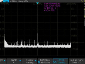 Hier sieht man im FFT bei 1 kHz-Modulation des Trägers, dass der Nebenträger bei 270 kHz Abstand "links" vom Hauptträger moduliert wird, der bei 130 kHz Abstand aber nicht (hat die Modulations-Verbreiterung nicht):