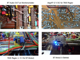 Ich habe an den beiden Halteschienen der Stereoplatine jeweils eine Bohrung vorgefunden, an die ich an der linken Seite das BT-Modul und an der rechten Seite einen 7805 Spannungsregler auf einer kleinen, ca. 3 x 4 cm Platine angeschraubt habe.