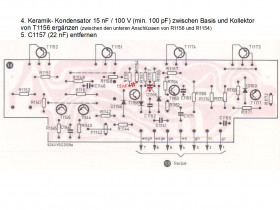 4. Ergänzen des Gegenstücks zu C1163 im positiven Zweig, der von Saba nicht vorgesehen war. Dort Keramik-C (15 nF / 100 V) zwischen Basis und Kollektor von T1156.
