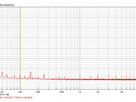 Das BT-Störsignal lässt sich auch in der FFT erfassen und zeigt, dass das konstante Sirren bei aktiver BT-Verbindung aus einer engen Folge von Störungen etwa gleicher Amplitude alle mit Einzelspitzenwerten < -120 dBV besteht, die von 100 Hz bis ca. 5 kHz reicht. Das ca. 7 Sekunden nach Musikende aber weiter bestehender BT-Verbindung stattdessen erscheinende getaktete Signal setzt sich aus der Folge 800 Hz, 1600 Hz, 2400 Hz, 3200 Hz usw. bis 4800 Hz zusammen, wobei die einzelnen Komponenten Amplituden von ca. -120 dBV haben. Hier hätte der Hersteller noch Nachbesserungsbedarf.