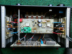 Es ist ein Gerät in zwei Gehäusen, der eigentliche Verstärker (rechts) und ein ausgelagertes Netzteil. Letzteres mit zwei Schnittbandkerntrafos, jeweils 200 VA und Ausgangsspannungen 32-0-32 V, einzeln (primär) abgesichert. Mehr ist dazu nicht zu sagen. Der Verstärker sieht etwas genauer so aus: