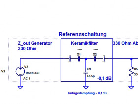 Ich habe mit meiner 10,7 MHz Keramikfilter-Ersatzschaltung (zur Simulation) nicht ganz die 330 Ohm Ein- und Ausgangsimpedanz des Datenblatts erreicht, sondern nur 297 Ohm. Das ist aber recht nahe (ca. -10%) dran, so daß die nachfolgenden Ergebnisse immer noch befriedigend verwertbar sind.