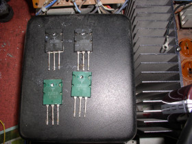 Als nächstes kam die Überprüfung der Endstufen, und auf einer Seite sind alle Endstufentransistoren defekt. Einer hat 0,2 Ohm in alle Richtungen, die anderen 2,5, 25 und 240 Ohm. Die Treibertransistoren messen sich einwandfrei. Also Elkos und Transistoren bestellt. Da die Original-Transistoren (2SA1301, 2SC3280) aus meiner Sicht am Rande der zulässigen Belastbarkeit betrieben wurden, habe ich den Ersatz eine Nummer größer bestellt (2SA1302, 2SC3281). Als Lieferant aus Kostengründen ISC, schaun mer mal.