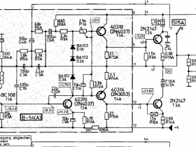 Eingangstransistor ist ein BC108 im Metallgehäuse. Auf den Boards sitzen zwei von unterschiedlichen Herstellern, die aber ziemlich ähnliche Daten haben. Wenn mich das beißt, habe ich irgendwo noch NOS Metallgehäuse BC108 von Signetics glaube ich. Der nächste im Bunde ist ein kleiner 1W 40319-PNP im TO5-Gehäuse. Der wirkt auf einen Gegentakt-Treiber aus einem 40314 (NPN) und einem weiteren 40319 (PNP).