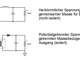 Galvanische Trennung von Ein- und Ausgangsseite ("Isolation") eines Gleichspannungswandlers möchte man u.U. haben, um eine sonst ggf. störende Erdschleife zu vermeiden. Ein potentialfreier Ausgang liefert eine feste Spannung zwischen den Polen des Ausgangs, aber mit schwebendem Massebezug. Es besteht jederzeit die Möglichkeit die zu versorgende Schaltung mit der schwebenden Masse zu verbinden, um ihr einen definierten Massebezug zu geben. In der Schaltung des Gleichspannungswandlers ist die Eingangsseite vollständig von der Ausgangsseite getrennt (nicht gekoppelte, getrennte GND/Massen-Bezüge).