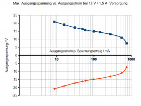 Maximale Ausgangsspannung (bei Versorgung mit 12 V / 1,5 A Steckernetzteil) pro positivem und negativem Ausgang (bei Last über + nach - also Verdopplung der Spannung bis max ca. 40 V bei kleinem Strom) als Funktion des Laststroms (pro Spannungszweig)