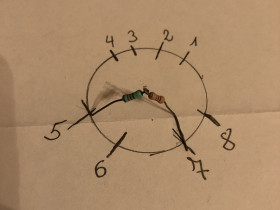 erstmal danke für Deine Mühe. Also die Drahtbrücke hatte ich zwischen 2 un3 gemacht. Hoffentlich ist dadurch nichts kaputt gegangen. Bei den Widerständen hatte ich keinen mit 2M. Ich habe dann von 7 nach 8 den 1M eingebaut und dann von 8 nach 5 nochmal 1M. Sollte doch genau so gehen oder? Auf dem bild habe ich die Drahtbrücke zwischen 2 und 3 schon durchtrennt. Weiter kann ich erst heute Abend machen. ich melde mich wieder.