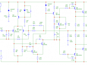 vielen Dank für deine Analyse. Tolle Sache. Allerdings kam diese Schaltung in abgeänderter Form zum Einsatz. Der Eingangsbereich, sowie C6 wurden geändert und C10 und C11 waren nur für Eventualitäten vorgesehen, falls das ganze schwingt. Sie wurden aber nicht verbaut. Ich lade das mal hoch, wie sie tatsächlich eingesetzt ist. Ich hab auch ein Design mit der gleichen Schaltung gemacht, in dem alles auf der Endstufenplatine untergebracht ist
