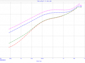 In der Simulation (leicht vereinfacht, ohne Strombegrenzung, Ruhestrom auf 25 mA pro Zweig gestellt) liegen die Verzerrungen bei 1kHz bei 1 Watt Ausgangsleistung an einem ohmschen Widerstand von vier Ohm bei deutlich unter 0,01%. Bei hohen Frequenzen 10 kHz, 20 kHz wird es etwas mehr 0,01% bis 0,02%. Untadelig.