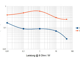 THD nimmt nicht mehr zu niedrigem Pegel hin (1 W und 0,1 W) zu, sondern bleibt ungefähr gleich oder nimmt sogar etwas ab. Erst bei <0,1 W nimmt THD wieder zu, weil der Rauschabstand dann zu klein wird. Die Zunahme ist also dem mit kleinerem Pegel stetig abnehmenden Headroom geschuldet, der zwischen Signalpegel und Rauschteppich noch bleibt, denn der Klirrabstand kann nicht grösser sein als der Signal-/Rauschabstand.