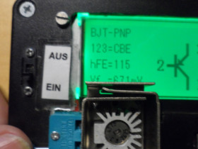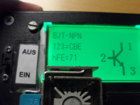 Der npn (neu von Michael mit 2N5230 bestückt) hat ein hFE von 71 in diesem Tester.