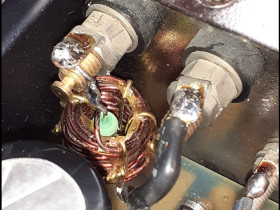Ein RL-Glied wurde im Ausgang ergänzt. Die Induktivität besteht aus einer selbst gewickelten Luftspule. 60 cm Lackdraht von 0,8 bis 1 mm Durchmesser, doppellagig auf einem 10 mm-Durchmessser-Dorn ergeben 18 Windungen, die durch drei Rändelschlaufen und etwas Klebstoff eng zusammengehalten werden. Der Wert landet so bei ca. 2,2 µH.