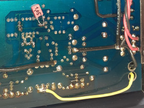 Lötseite, der Folienkondensator wurde dort untergebracht. Kurzschluss ist nicht zu befürchten, die Beine haben höhentechnisch ausreichend Abstand zu den vorhandenen Lötpunkten und könnten aufgrund der Stabilisierung durch das Kondensatorgehäuse nur mit recht hoher Kraft angedrückt werden.