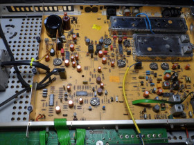 Dieses Verfahren war so (es steht so natürlich auch im Service Manual und ist das Standardverfahren) nicht durchführbar. Lediglich an der Banduntergrenze (87,5 MHz, Linksanschlag Skalenzeiger) war mit dem Spulenkern (Alu-Schraube) der Oszillatorspule der Abgleich möglich. Beim Versuch, mit dem Kapazitätstrimmer anschliessend bei/auf 106 oder 108 MHz (Rechtanschlag) abzugleichen, war bestenfalls eine Annäherung bis auf ca. zwei MHz an die Sollfrequenz möglich. An einem bestimmten maximalen Drehwinkel des Trimmkondensators brach die Empfindlichkeit (der "Empfang") zusammen, ohne sich weiter der Sollfrequenz nähern zu können.