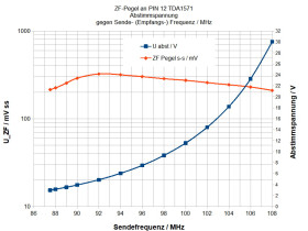 Weil es Andreas interessiert, wie sich die Oszillator-Amplitude, bzw. die ZF-Amplitude am Ausgang PIN 12 des Mischers TDA1571, ändert, habe ich die nun auch gemessen.
