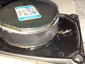 Magnet und Spulenplatte sind rundum verklebt, das Lösen dieses dauerelastischen Klebstoffes auf mechanischem Weg ist etwas mühsam, aber machbar. Im Bild sieht man nur noch Reste der umlaufenden Klebstoffraupe.