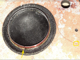 Der gelbe Pfeil zeigt auf das lose Spulenende, das für die Instandsetzung wieder mit der oberen Anschlussfahne verbunden werden müsste. Mit viel Lötkunst und dünnem Lackdraht wäre das evt. möglich, dieses Mal sehe ich davon ab, ich werde neue Ersatzhochtöner unter Zuhilfenahme der originalen Kunststoffträger einbauen.